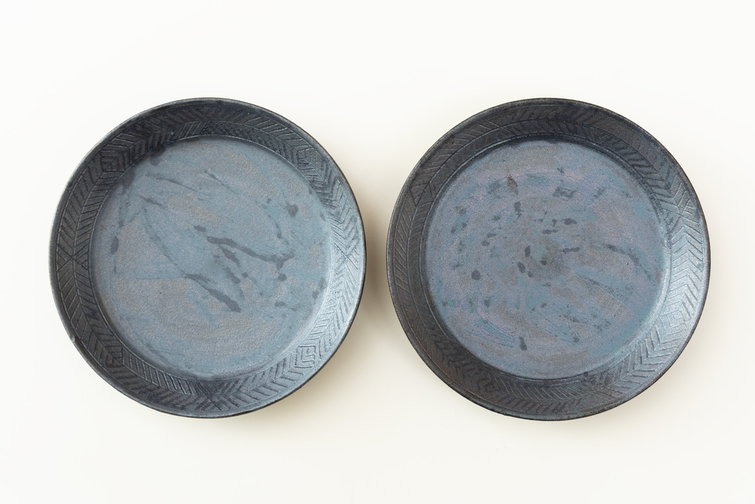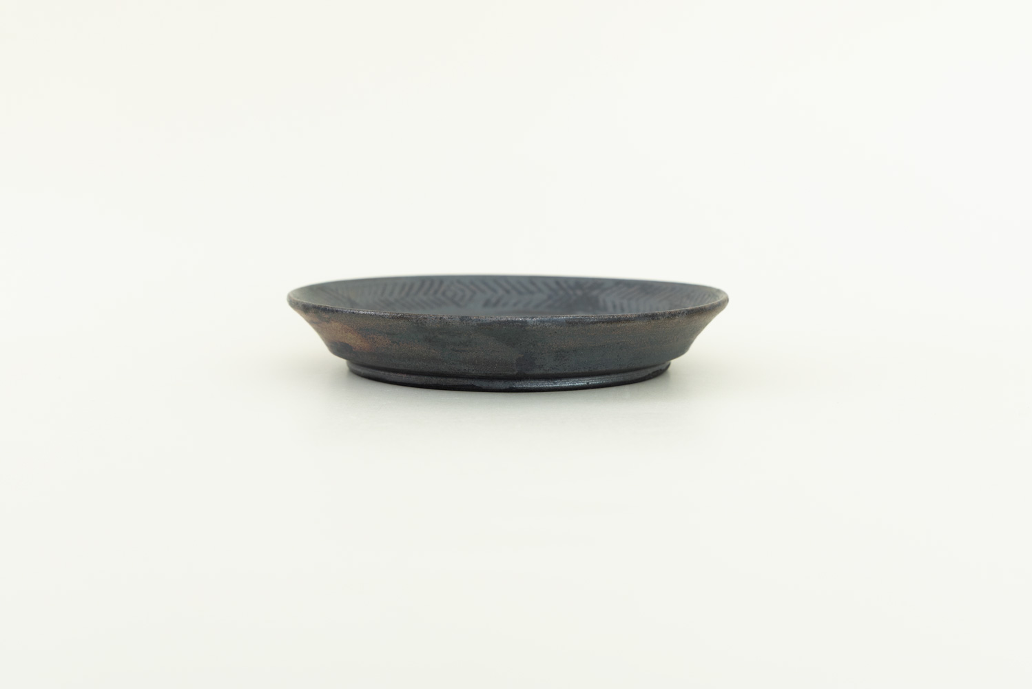 鉄分を含んだ釉薬による、深みのある色合いと揺らぎのある景色が印象的な一枚。縁に施された文様がさりげないアクセントとなり、全体を引き締めています。取り皿や菓子皿、酒肴にも使いやすいサイズ感。料理を受け止めながら、食卓に静かな存在感を添えてくれます。