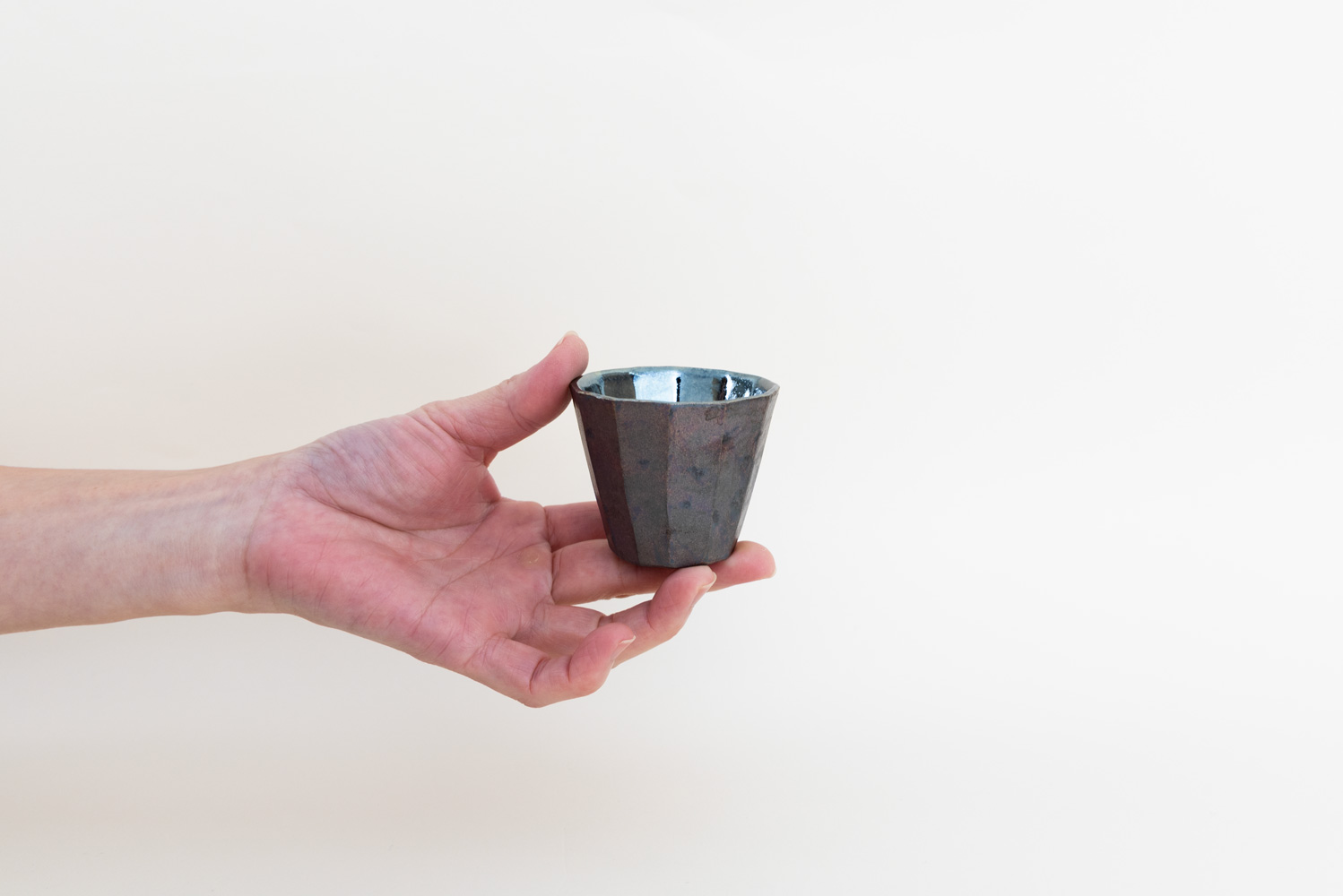 外側は落ち着いた金属質の光沢をまとい、面取りによる陰影が美しく浮かびます。内側は艶やかな釉調で、酒を注ぐとより一層表情が際立ちます。手にすっと収まるサイズ感で、口当たりも軽やか。静かな存在感で、特別な一杯を引き立ててくれるぐい呑みです。