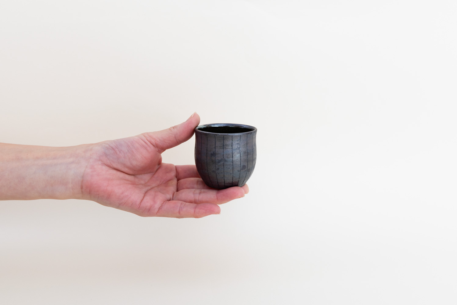 外側は落ち着いた鉄彩、内側には艶やかな紅彩を施しています。縦に入った細い線文がすっきりとした印象を与え、光の角度でやわらかく色味が変化します。ややすっきりとした立ち姿で、指に心地よく収まるかたちです。酒を注ぐと内側の紅彩がほのかに映え、穏やかな時間を楽しめます。