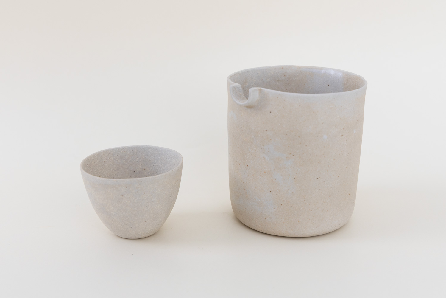 マットな触り心地で手にやさしく馴染む、軽やかな片口です。素朴な質感ながら汚れにくく、日常使いにも扱いやすい仕上がりとなっています。やわらかな白の表情が食卓にすっと溶け込み、酒器としてはもちろん、ドレッシングや出汁入れとしてもお使いいただける器です。