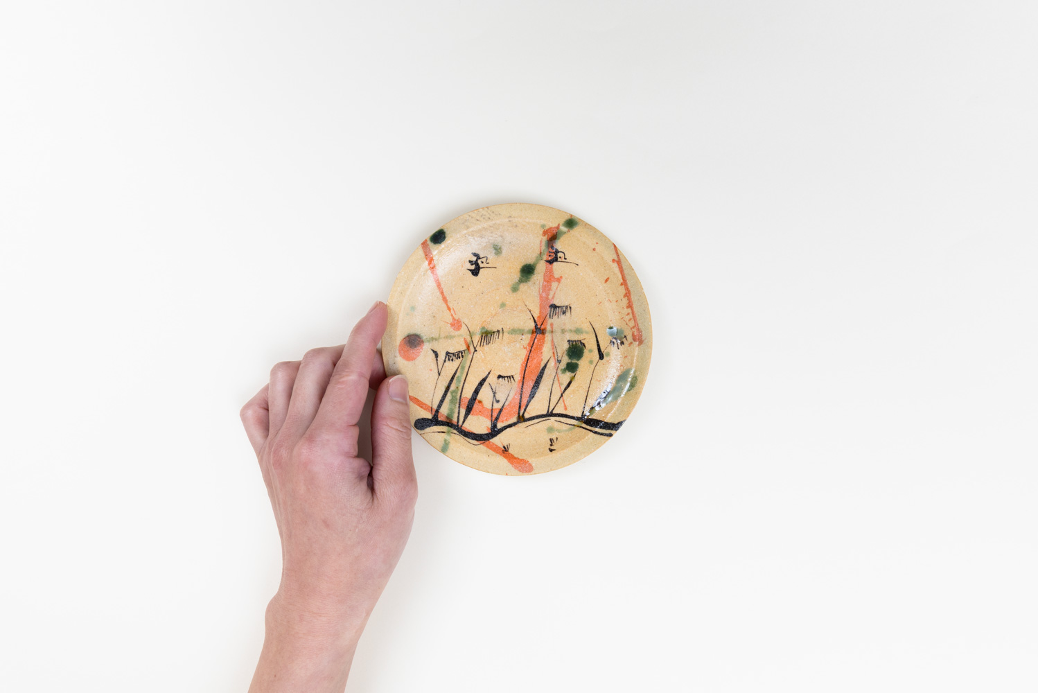 澤さんならではの愛嬌のあるモチーフが一つ一つ丁寧に描かれ、見込むたびに表情を変えてくれる、眺めるほどに楽しい一枚です。織部らしい大胆さの中にも、素朴であたたかな表情が感じられます。取り皿や菓子皿としてはもちろん、酒肴を盛っても映える存在感。食卓に置くだけで、ぱっと空気が華やぐ器です。