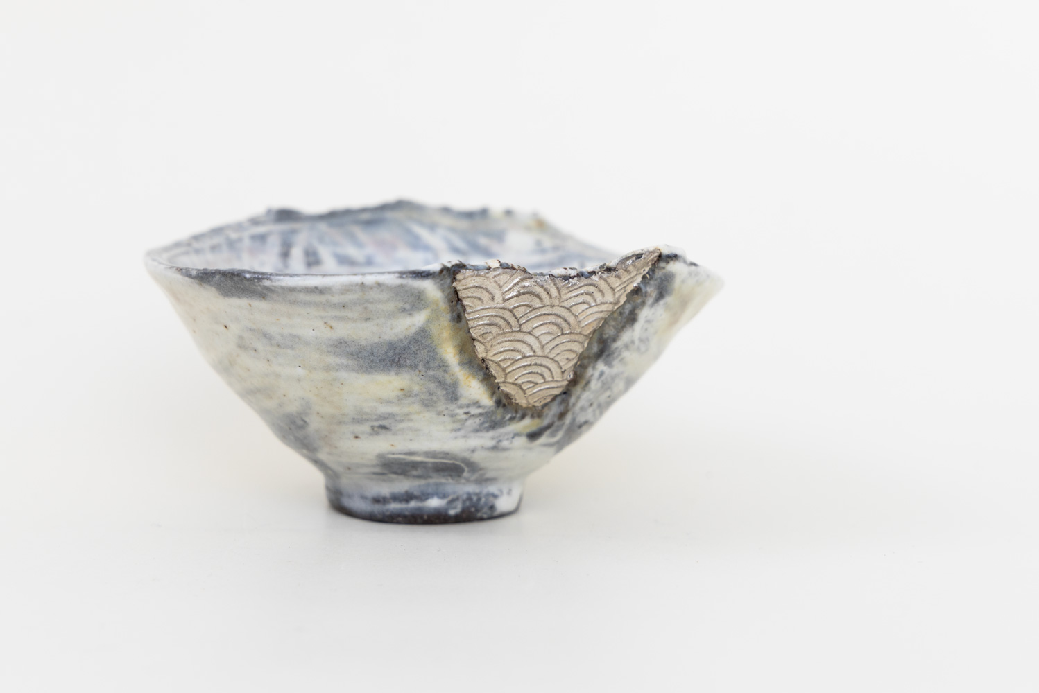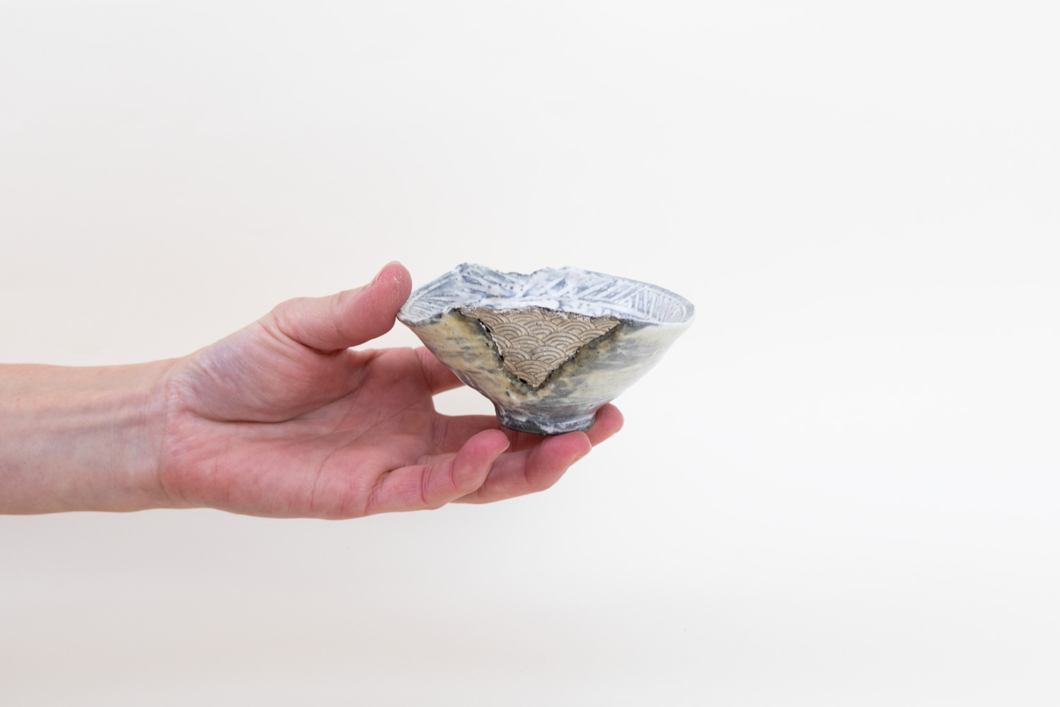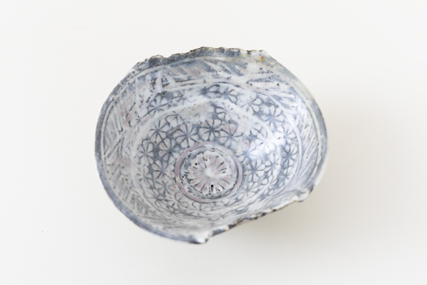 白土の象嵌模様が特徴的な三島。淡い水色の刷毛目から見え隠れする三島模様は非常に表情豊かで趣深い味わいを感じることができます。さらに銀彩が施されることにより、より唯一無二の存在感を与えています。