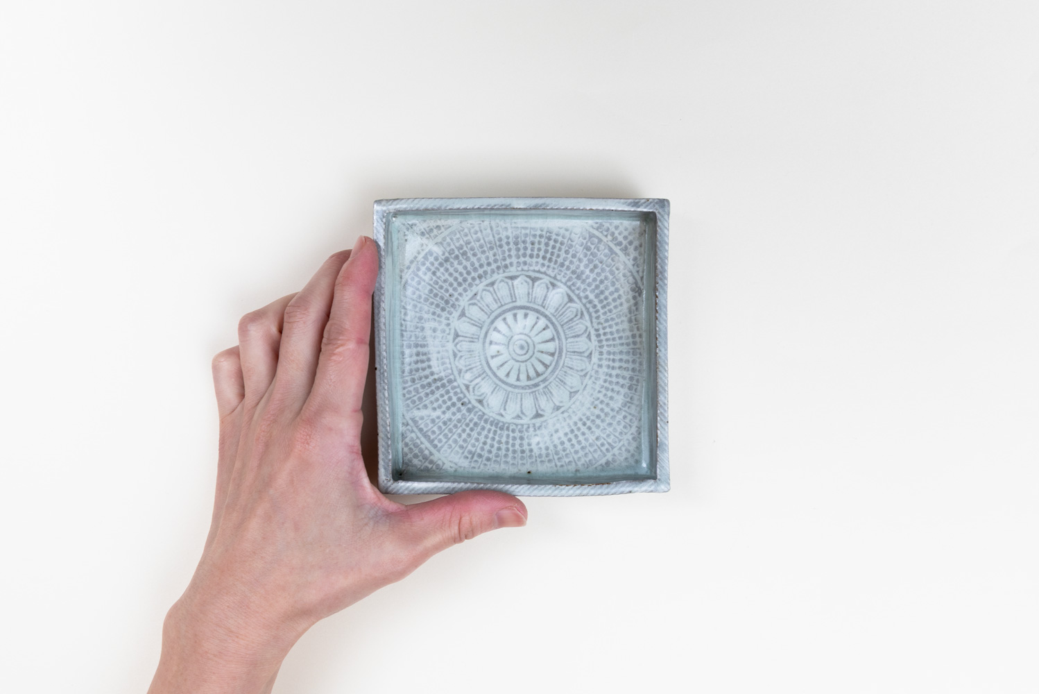 白土の象嵌模様が特徴的な三島。点や線、印花の配置や間隔に作家個々の特徴が存分に現れるうつわであると言えるのではないでしょうか。伝統的な印象のものから、新しい形や印花を取り入れた現代的なものまで、鈴木さんの魅力が存分に詰まった作品です。取り皿としてはもちろん、和菓子やお造り、前菜の盛り付けにも。平らな見込みが料理を美しく引き立て、余白も楽しめます。