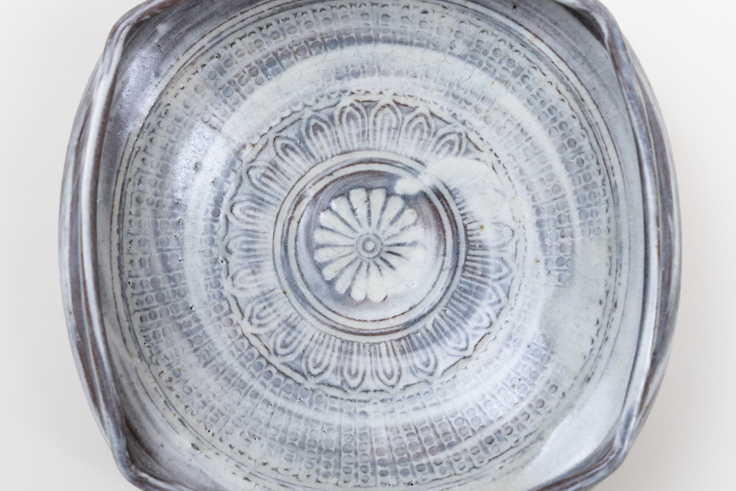 白土の象嵌模様が特徴的な三島。点や線、印花の配置や間隔に作家個々の特徴が存分に現れるうつわであると言えるのではないでしょうか。伝統的な印象のものから、新しい形や印花を取り入れた現代的なものまで、鈴木さんの魅力が存分に詰まった作品です。