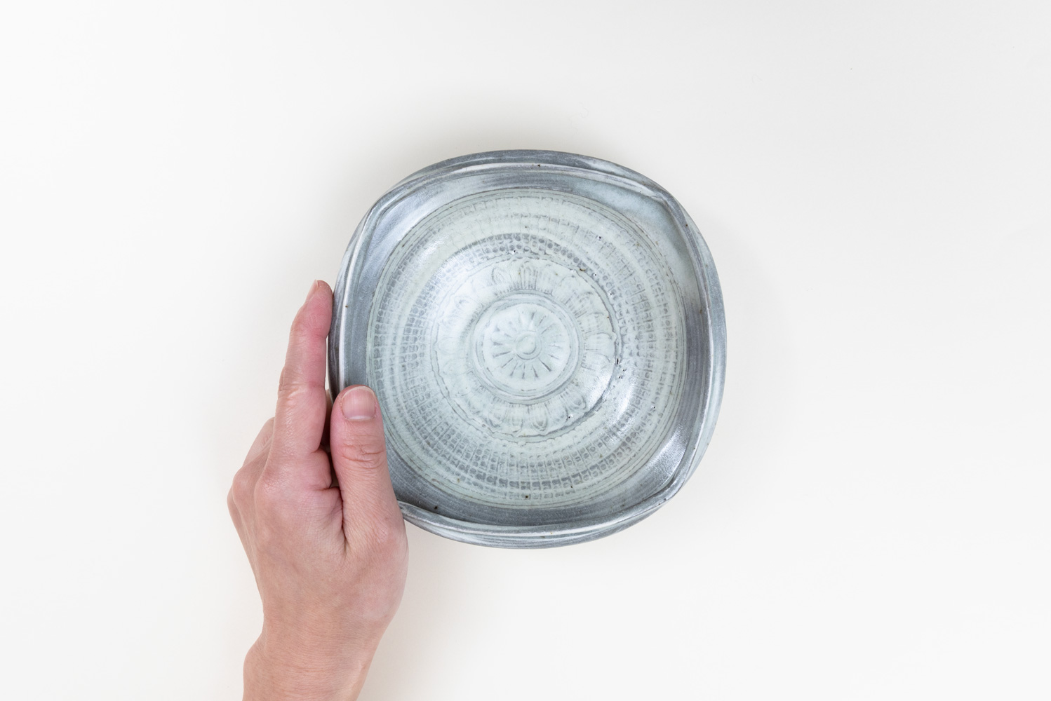 白土の象嵌模様が特徴的な三島。点や線、印花の配置や間隔に作家個々の特徴が存分に現れるうつわであると言えるのではないでしょうか。伝統的な印象のものから、新しい形や印花を取り入れた現代的なものまで、鈴木さんの魅力が存分に詰まった作品です。