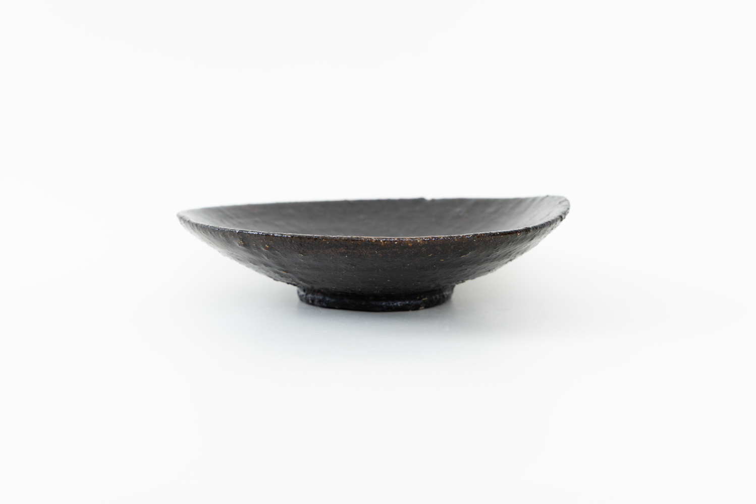 しっとりとした艶と深みのある黒色が上品な一枚です。やわらかく立ち上がる縁と、見込み中央のゆるやかな凹み。釉の濃淡やわずかな景色の揺らぎが、静かな存在感を生み出しています。光を受けると艶が浮かび、料理を引き立てます。取り皿や副菜皿としてはもちろん、和え物や焼き魚、季節の前菜などにも。黒の背景が食材の色味を際立たせ、盛り付けに奥行きを与えます。