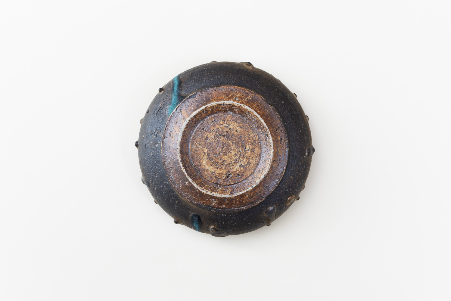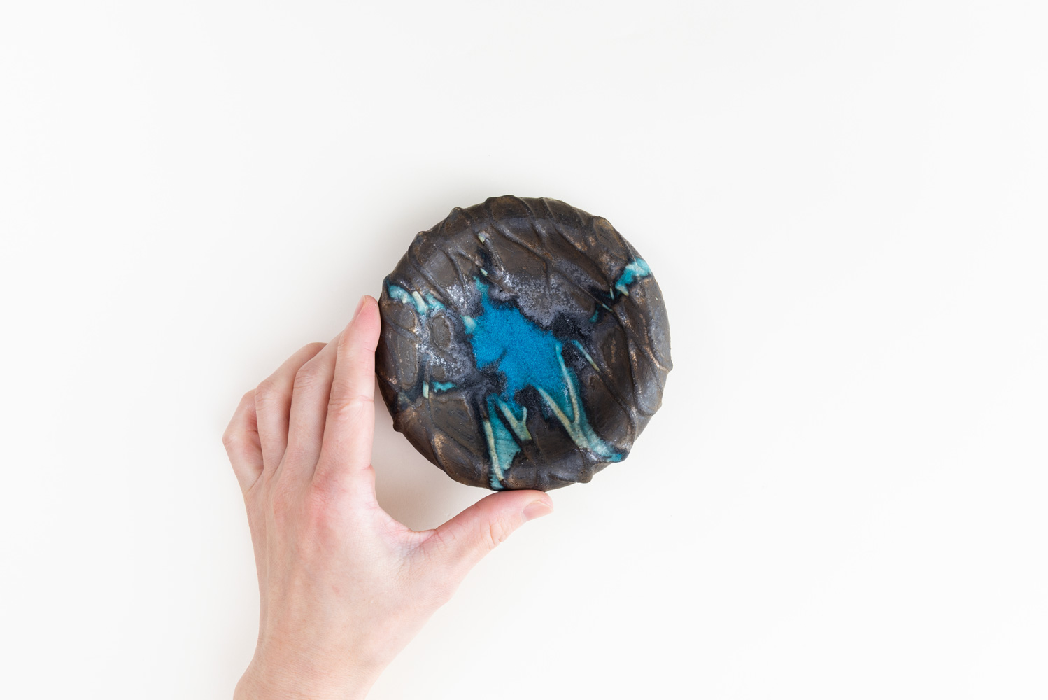 溜まりのように現れた青は、まるで岩間を流れる水のよう。力強い土肌との対比が、印象的な景色を生み出します。中央がややくぼんだかたちは、小さな菓子や前菜、一口の肴を引き立てる設え。