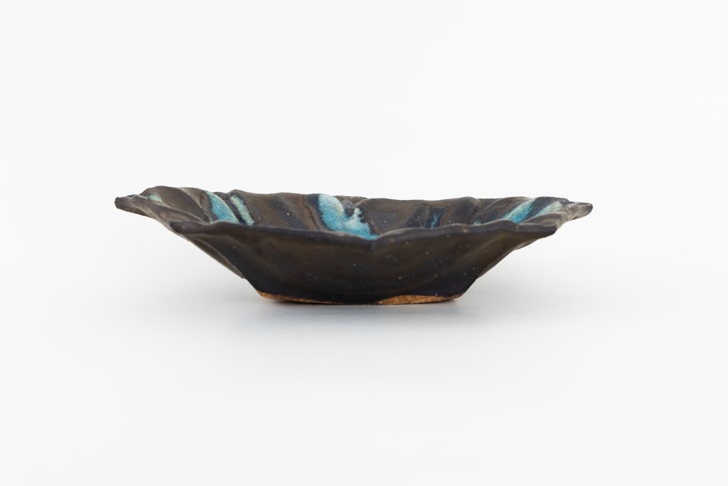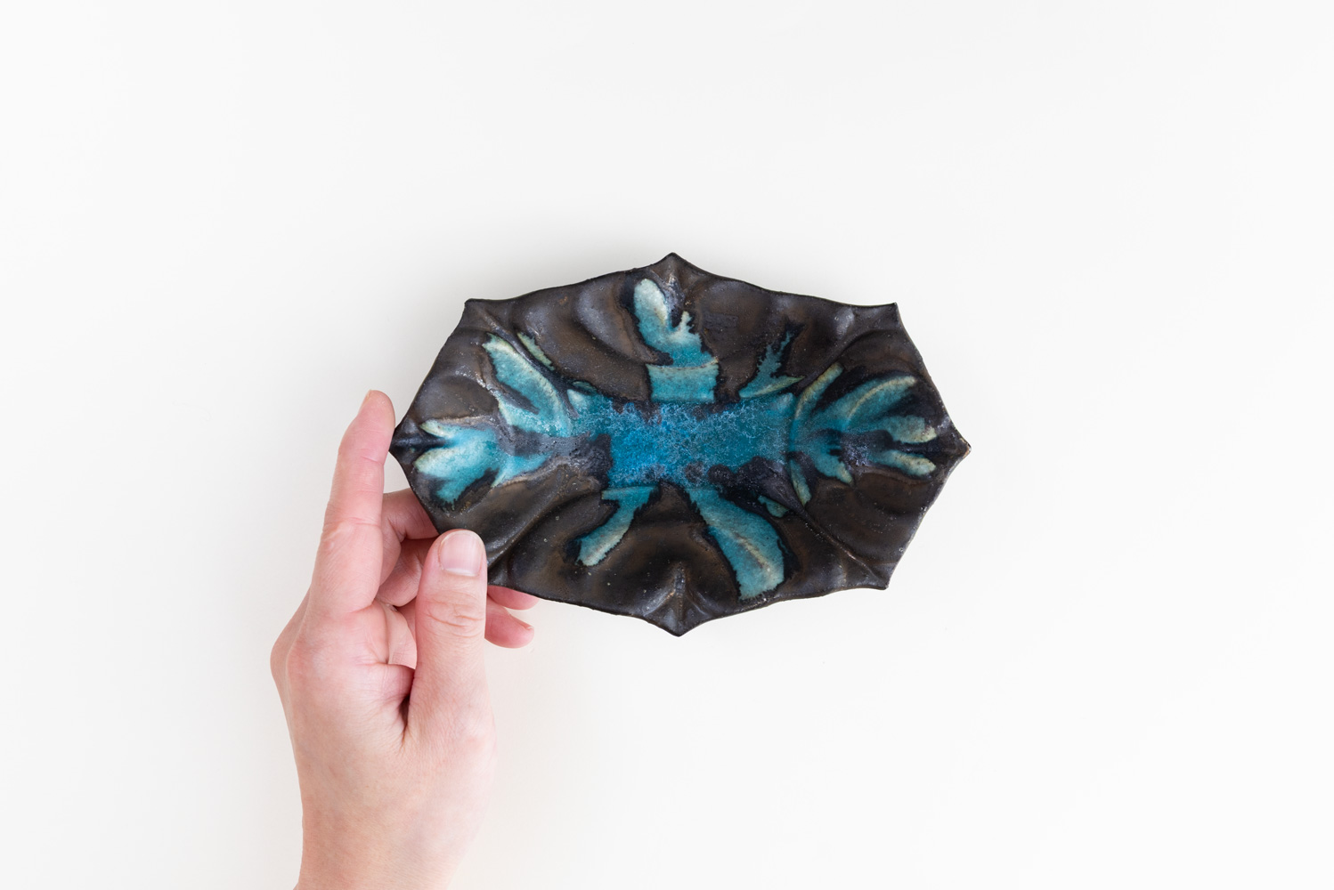 やわらかな稜線が重なり、さりげなく“ハート”を忍ばせた長方鉢。中央に溜まる青が、まるで鉱石のような力強さを感じさせます。テーブルの中央に置いても映える、景色を楽しむための鉢です。