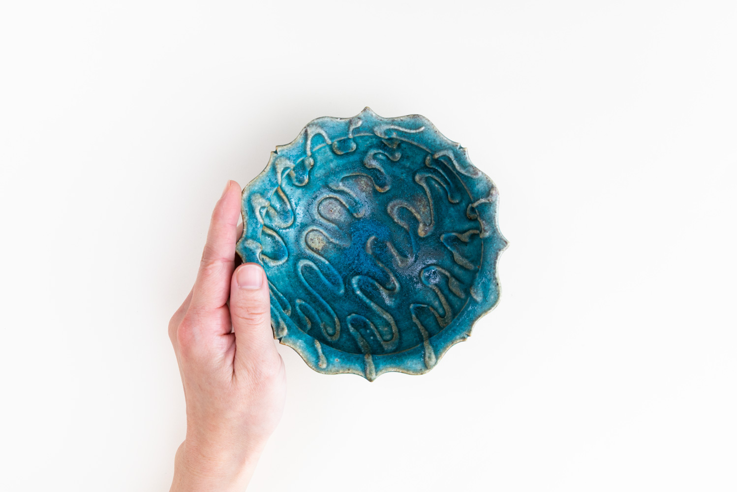 全体を包む澄んだ青の釉は、湖面のような静けさ。内側に浮かぶやわらかな文様が、光を受けて穏やかな陰影を描きます。料理の色を明るく引き立て、食卓に軽やかさを添える一鉢。和え物や冷菜、デザート鉢としても心地よいサイズです。