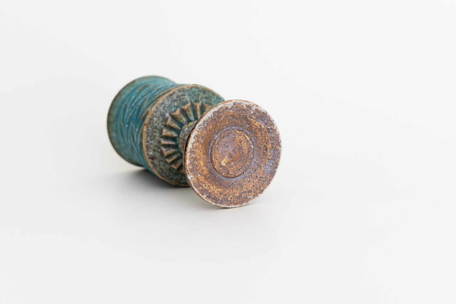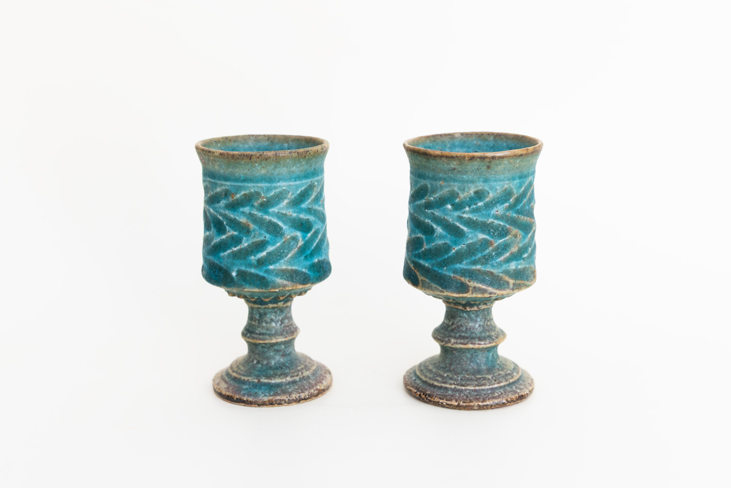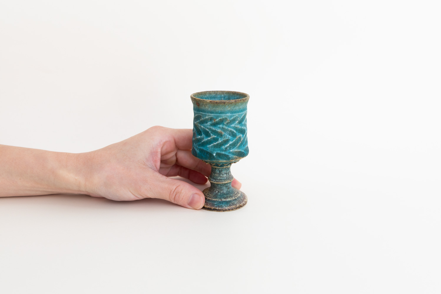 小さいサイズのゴブレットです。細部のデザインが洗練された作品です。足の部分は削り出して作られており、削るタイミングは絶妙な粘土の乾き具合でないと難しいそうです。ぐい呑と同じようなサイズなので日本酒にもどうぞ。