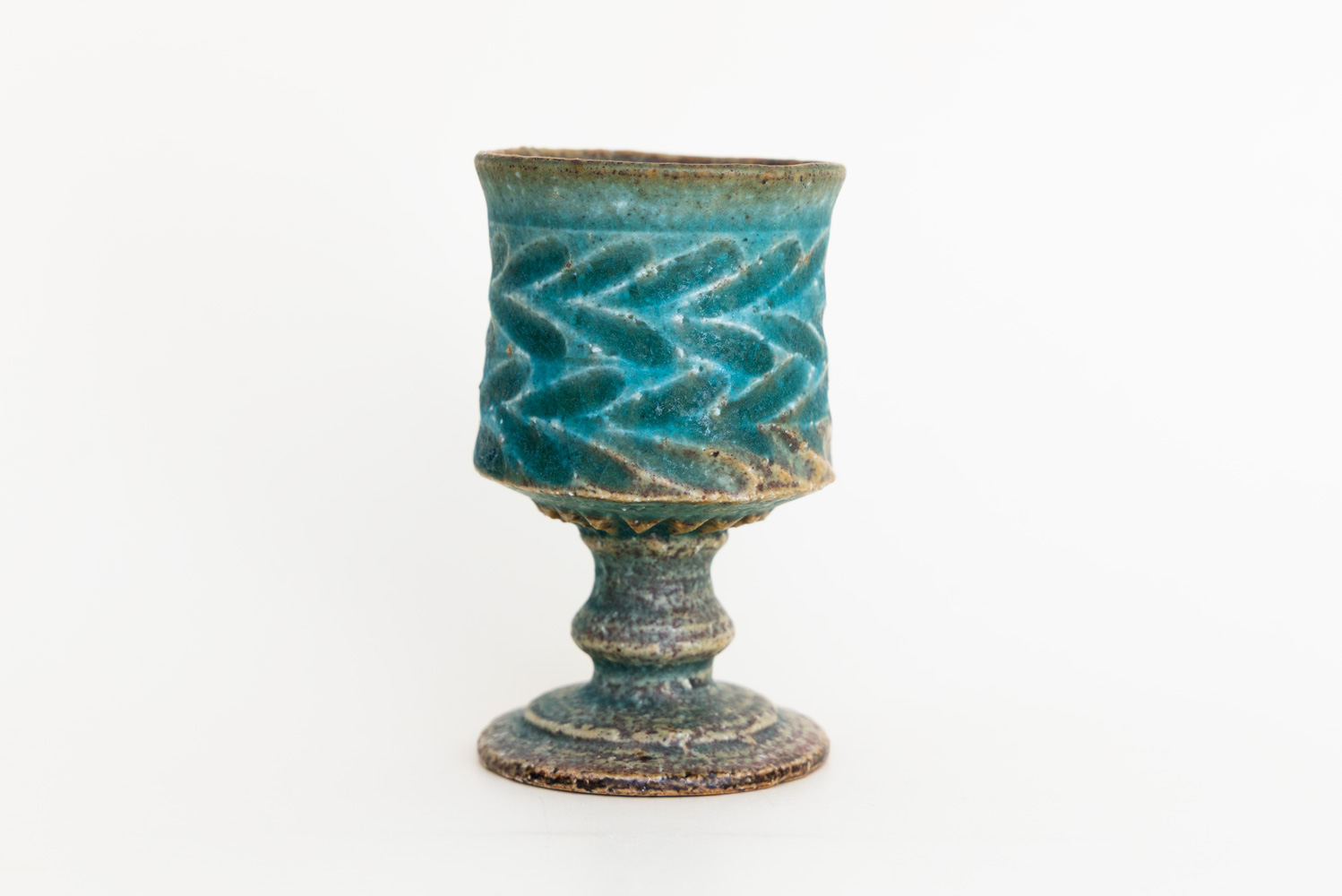 小さいサイズのゴブレットです。細部のデザインが洗練された作品です。足の部分は削り出して作られており、削るタイミングは絶妙な粘土の乾き具合でないと難しいそうです。ぐい呑と同じようなサイズなので日本酒にもどうぞ。