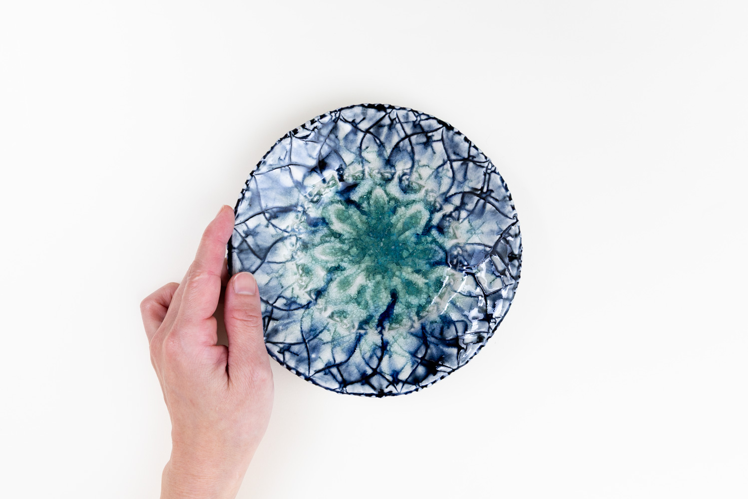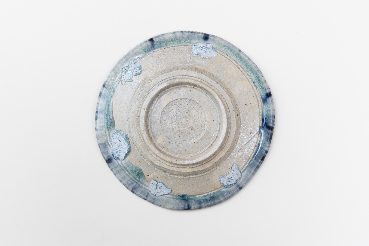 中央に広がる淡い青緑の景色、その周囲を囲む花文や唐草。一枚ごとに構図や雰囲気が異なり、まるで小さな絵画のような存在感を放ちます。5.5寸(約16〜17cm)の程よいサイズは、取り皿やデザート皿、副菜皿として幅広く活躍。“選ぶ楽しみ”と“出会いの一枚”。一点ものの魅力を味わっていただける灰釉呉須の5.5寸皿です。