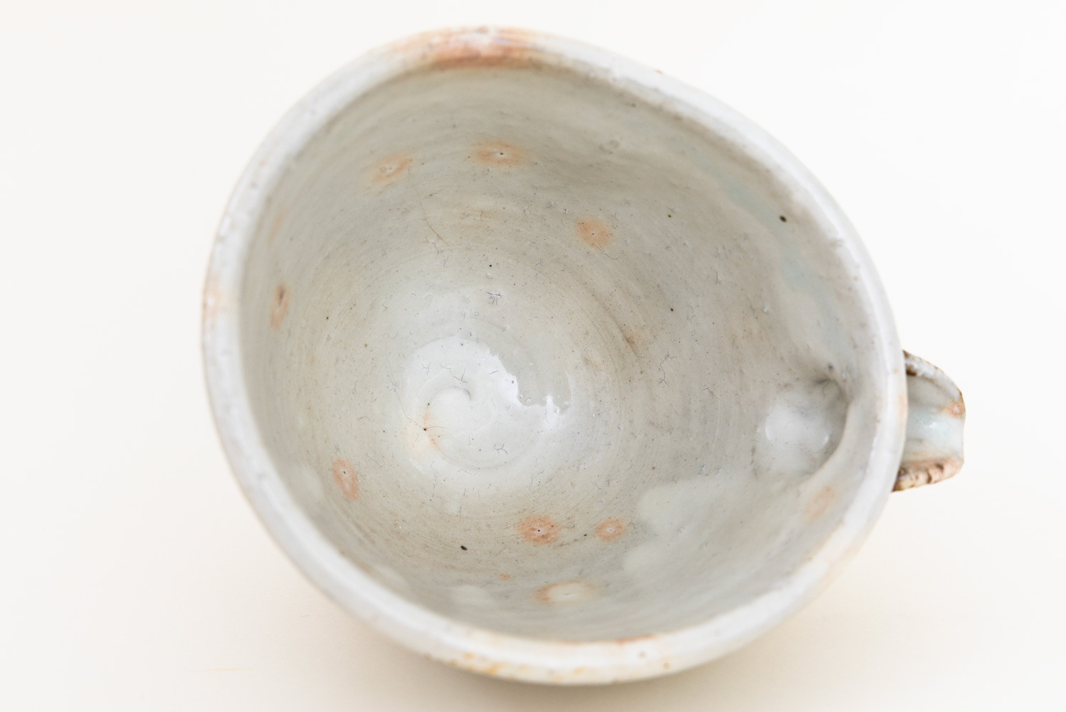 白のやわらかさの中に、ほのかに差す紅。口縁には自然な焦げの表情。高台まわりには土の力強さが残り、甘さの中に凛とした芯を感じさせます。一つひとつ異なる紅の出方は、