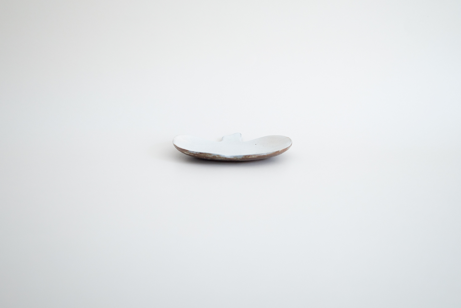 りんごのシルエットを切り取ったようなかわいらしい小皿です。小さなお菓子をのせたり、小さめの取り皿としてもお使いいただけます。その他に粉引の中サイズと錆釉の小サイズと中サイズをご用意いたしております。